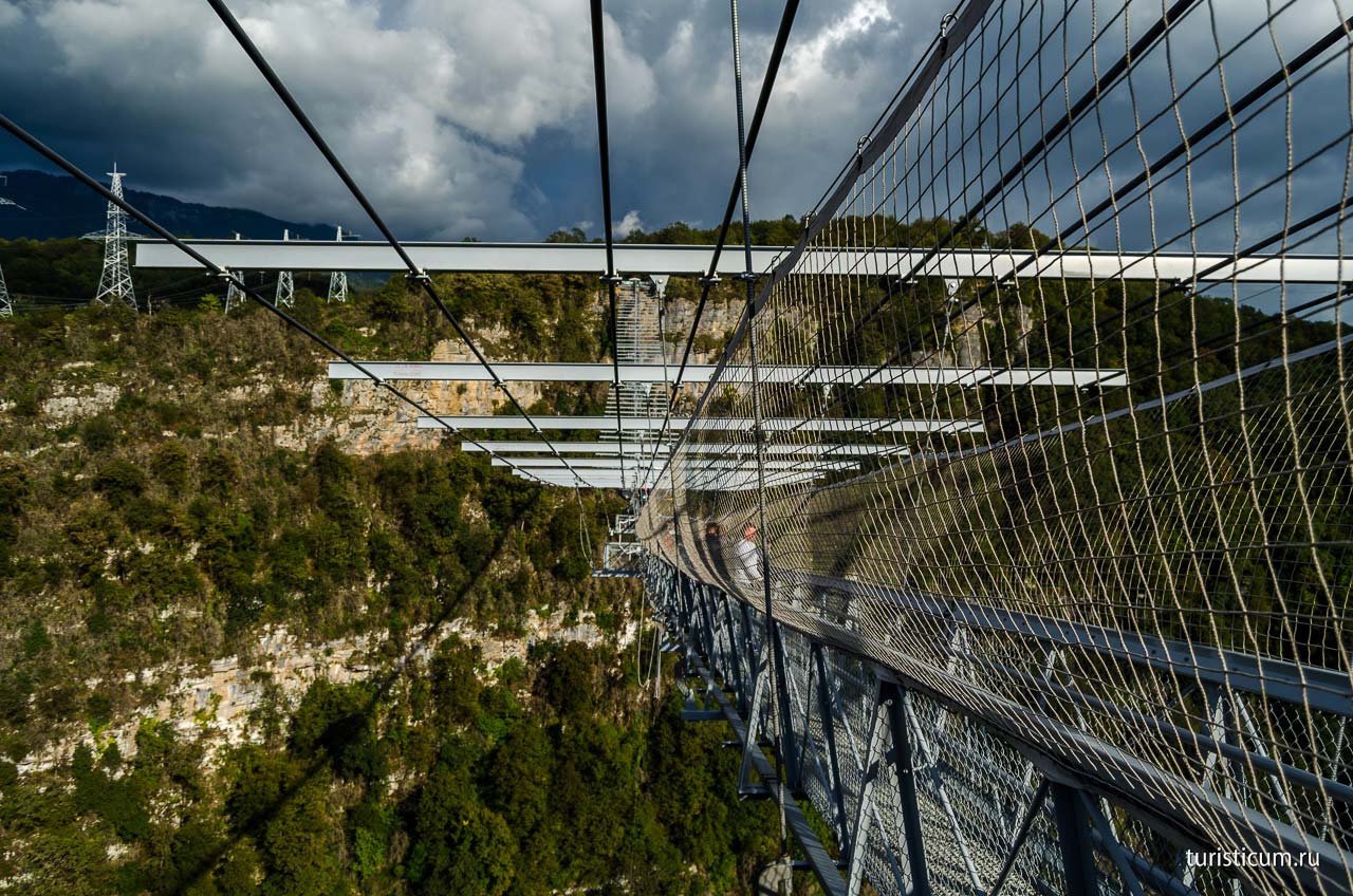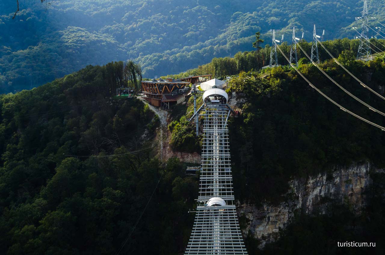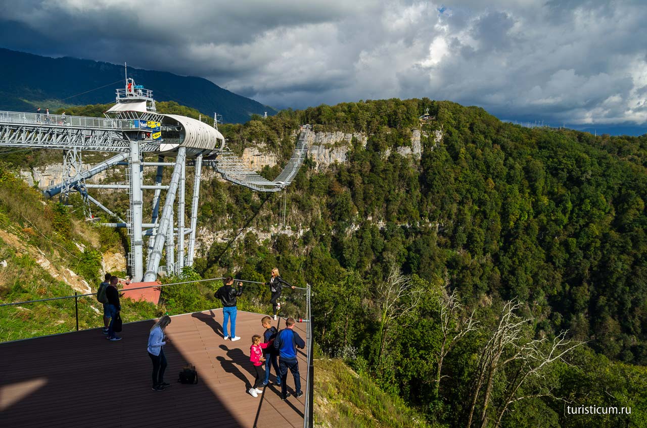 Просто прогуляться по подвесному мосту в Скайпарке тоже доставит огромное удовольствие. Не каждый день вот так запросто можно пройтись по подвесной конструкции закрепленной на высоте 70-ти этажного здания. Поскольку мост очень узкий, а остановиться и насладиться окружающими красотами очень хочется, в его конструкции предусмотрены небольшие карманы, смотровые площадки. Поскольку с одной стороны Ахштырское ущелье ниже, чем с другой, в конце моста вас ждет подъем в несколько десятков ступеней. Наградой за затяжной подъем станет смотровая площадка, откуда открывается незабываемый вид подвесного моста, и даже не верится, что вы перешли по нему через пропасть.
