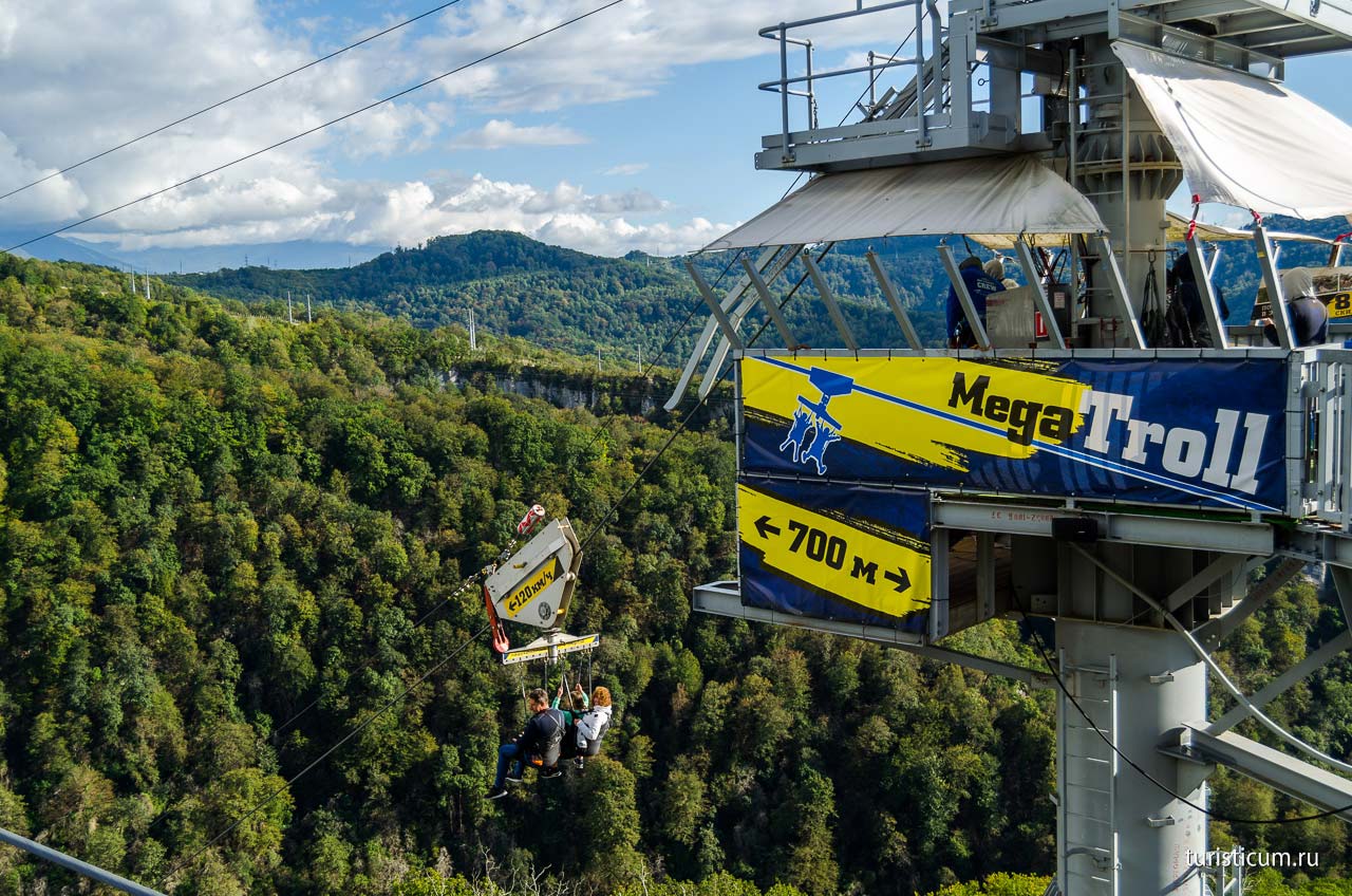 Рядом расположена еще одна башня, откуда совершает свой вылет самый настоящий высокогорный скоростной троллей — MegaTroll. Этот аттракцион даже вызывает некоторое чувство уверенности в своих силах. Во-первых здесь вы не один, а в паре с товарищем, аттракцион вмещает до трех человек а во-вторых вам даже прыгать не придется, вас крепко спеленают и отстегнут удерживающий механизм. Троллей лихо ускорится и промчит вас вниз ущелья. Похожий аттракцион это качели SochiSwing. Схема такая же, только полет ваш будет иметь траекторию качелей. На качелях можно прокатиться и одному, если вы ни с кем не хотите делить свой адреналин или ваша вторая половинка более благоразумна, чем вы.