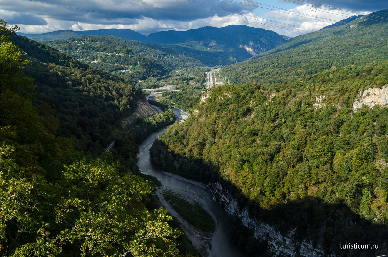 Вот мы вступили на подвесной мост Скайпарка и кроме самого моста, нам открываются две красочные панорамы. С правой стороны видно Форелевое хозяйство, от которого начинался ваш путь, если вы приехали на автобусе, дальше череда гор, а за ними Черное море. По другую сторону моста видна дорога, убегающая по ущелью в сторону Красной Поляны и предгорья главного Кавказского хребта.