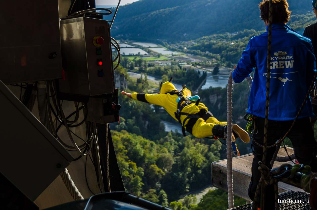 Настоящие профессионалы вас закрепят, объяснят вам технику безопасности, короче говоря они сделают за вас все, кроме самого главного. Прыгнуть вы должны сами. Надо сказать, что в момент перед прыжком включают очень громкую и заводную музыку, а собравшаяся вокруг публика поддерживает прыгуна овациями и улюлюканьем. Тут уж трудно устоять на месте, но ноги все равно предательски подкашиваются. После прыжка вам выдадут сертификат и вручат эксклюзивную футболку, которую нельзя купить, на которой будет написано что вы совершили прыжок с 207 метров. Если вы откажетесь от прыжка, деньги за него вам не вернут, но у вас будет возможность совершить свой прыжок когда угодно, заплатить придется только за вход в парк.