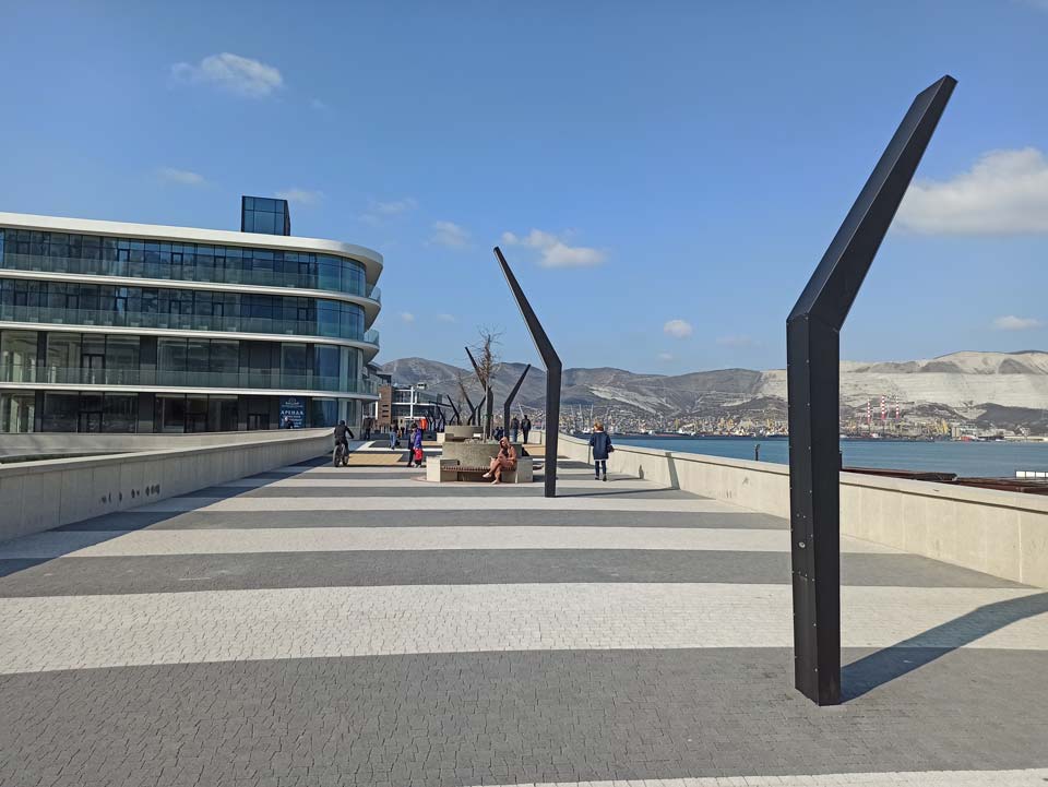 Проект набережной в историческом центре Новороссийска изначально предусматривал два уровня. В итоге верхний ярус стал удобной пешеходной дорожкой, а нижний — пляжной зоной у самой воды. Небольшой участок набережной проходит по территории действующего яхт-клуба «Русское море», и чтобы сохранить его функциональность, на нижнем ярусе были обустроены стоянки для яхт.